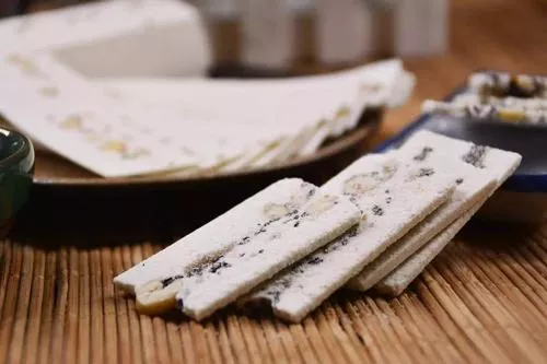 合川桃片 由合川桃片厂生产,已有140多年历史( 重庆) 合川桃片始创于1840年。用上等糯米、核桃仁、川白糖、蜜玫瑰等原料,精制加工而成,是重庆市地方名产之一。特点为粉质细润,绵软,片薄,色洁白,味香甜,突出浓郁的桃仁,玫瑰香味。1917年曾在巴拿马博展会上,获巴拿马金质奖。合川桃片地理标志产品保护范围为重庆市合川区现辖行政区域。,合川桃片,合川桃片简介,合川特产