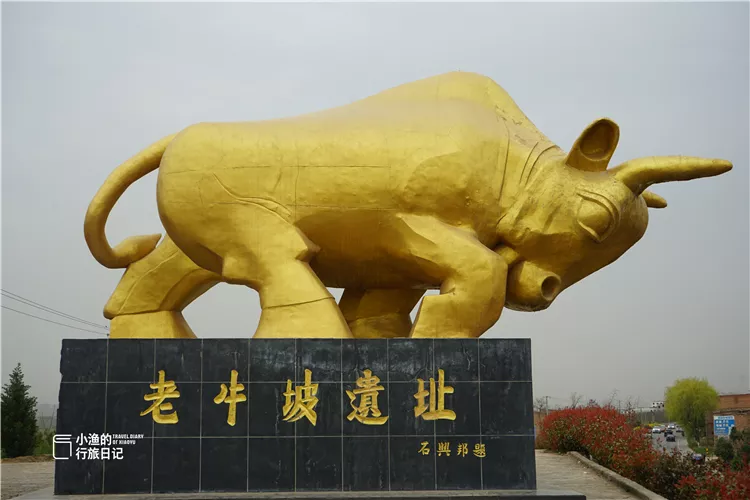 整个土坡并不长,大概就二十多米。走到尽头便是一头金光闪闪的铜牛,面朝着312国道,想要腾空跃起的姿态。铜牛底座上写着“老牛坡遗址”,为石兴邦所题。