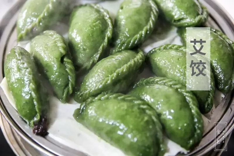 艾饺:清明艾饺为浙江地区汉族清明节节日食俗,用艾叶和面,白糖、麻屑作馅。颜色翠绿,味道清香。形形色色的艾饺,艾饼,柔软又带着清爽的香气,很有弹性,似粘非粘,微微沙却不腻人,