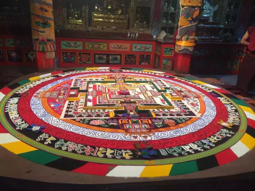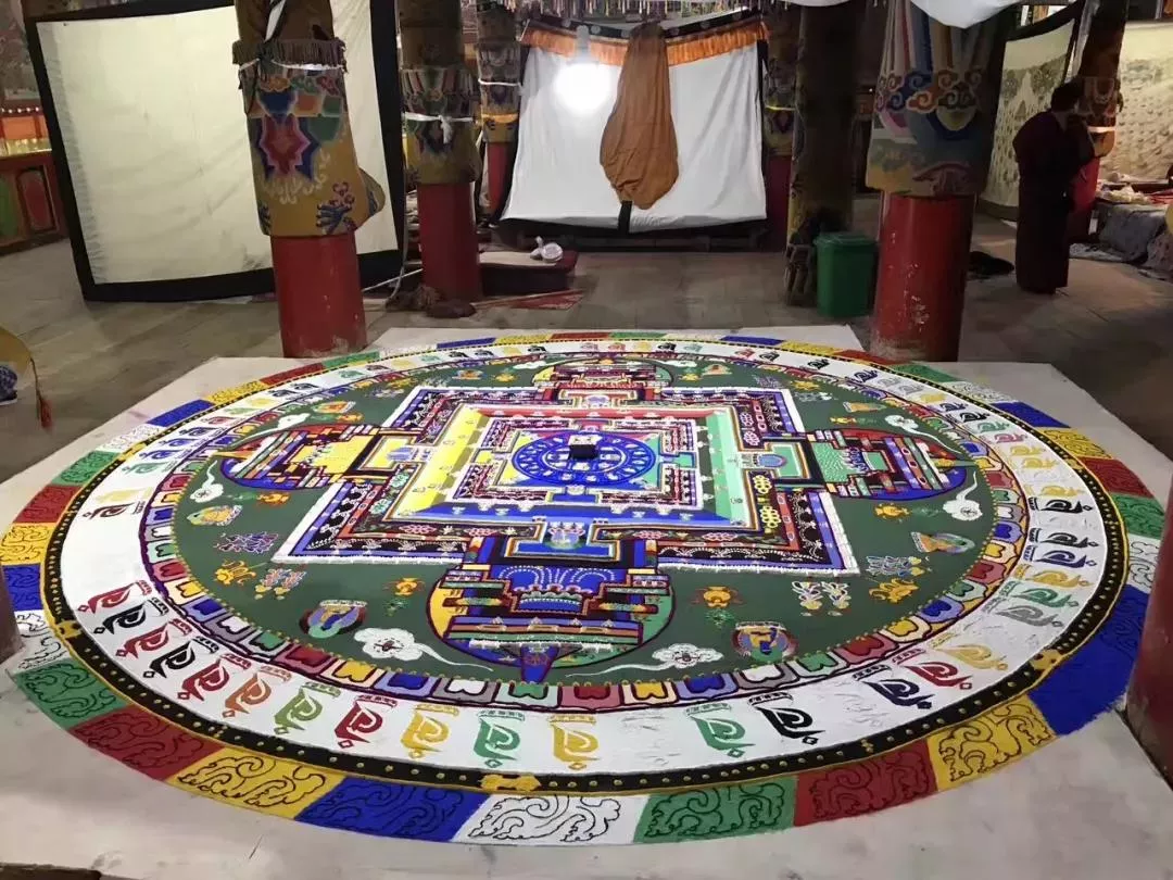 坛城沙画,在藏语中叫做的dul-tson-kyil-khor,意思是“彩粉之曼陀罗”。繁华世界,不过一掬细沙。从两千五百多年前,佛陀亲自教导弟子制作沙坛城开始,这门精致绝伦的宗教艺术,就历代相承毫无间断。