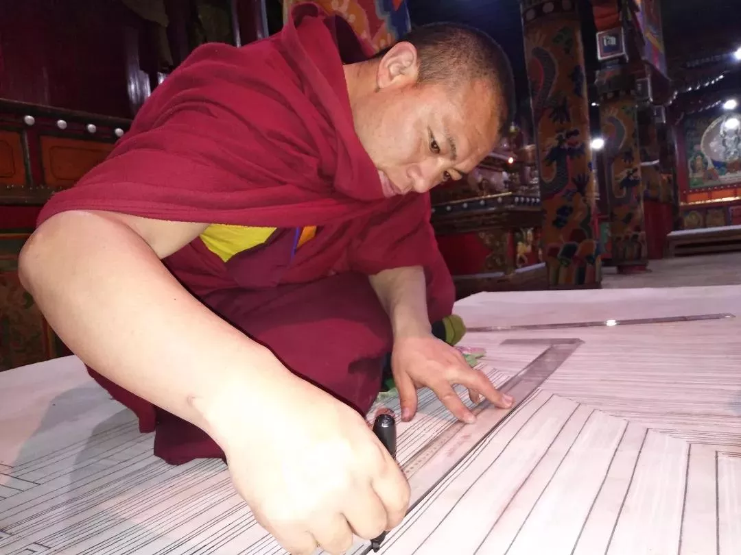 绘制坛城是一个艰辛而细致的过程,僧人要戴着口罩,事先磨成小颗粒状的沙子装在特制的锥形容器里,通过或轻或重的敲打控制流量,将沙子漏在模板上,细细堆砌、勾勒,而且要全神贯注、一丝不苟,稍有不慎,就要前功尽弃,依尺寸不同,需费时数日到数月不等的时间。