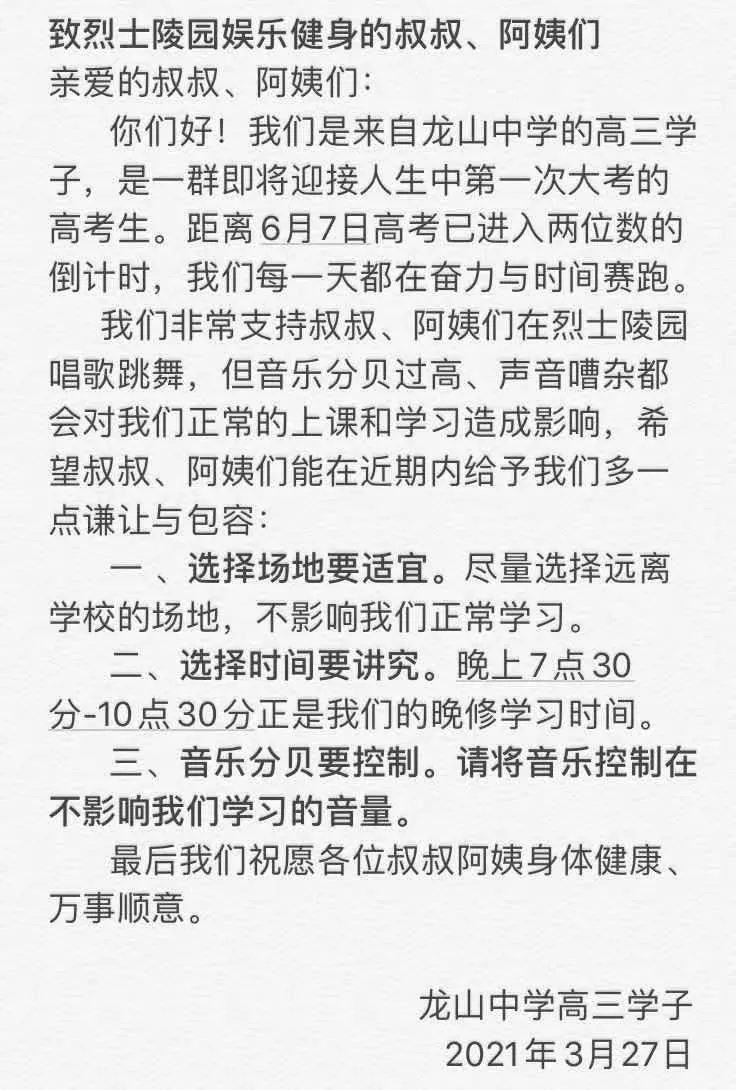 我们非常支持叔叔、阿姨们在烈士陵园唱歌跳舞,但音乐分贝过高、声音嘈杂都会对我们正常的上课和学习造成影响,希望叔叔、阿姨们能在近期内给予我们多一点谦让与包容。