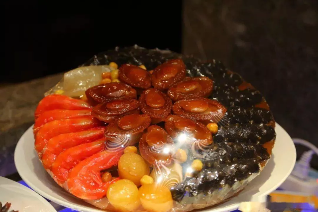 要说孚利泰最具特色的菜品之一,便是这非物质文化遗产项目“手拉活海参”。所谓“手拉活海参”,就是用拉伸的技术,把活海参抻拉成为薄而透明的大片,再进行烹制食用,别有风味。如果把拉的薄薄的海参大片平铺在报纸上,可以透过海参清晰地看到报纸上的字。"