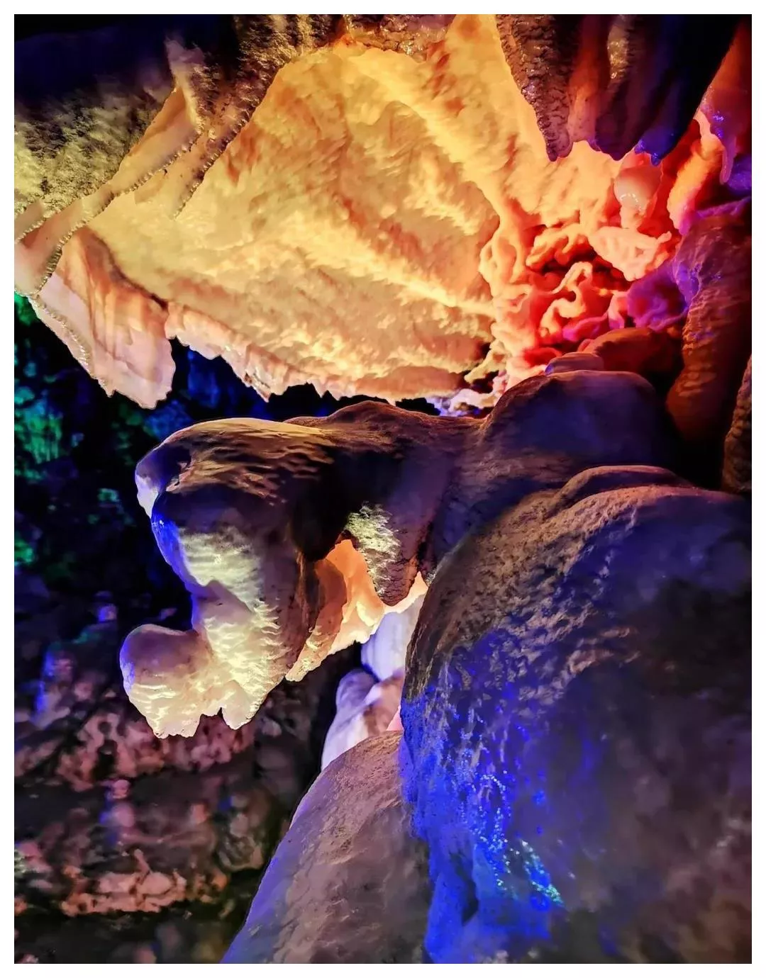 从洞门大厅往里走,沿途可见石笋和钟乳石。往下走60级石坎,再向上登108级石坎后,一个更高、更宽、更大、更奇的溶洞展现在眼前。