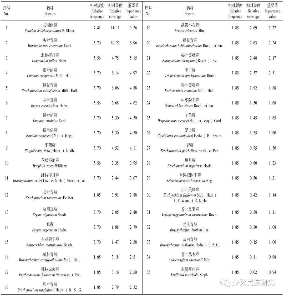 对35种苔藓植物重要值的计算结果表明,长帽绢藓( EntodondolichocucullatusS.Okam.)、尖叶青藓( BrachytheciumcoreanumCard.)、北地扭口藓( DidymodonfallaxHedw.)等为群落优势种(表3),表明这些物种在群落中起控制作用。