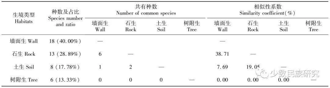 表4宫城遗址苔藓植物生境类型及生境间物种相似性系数