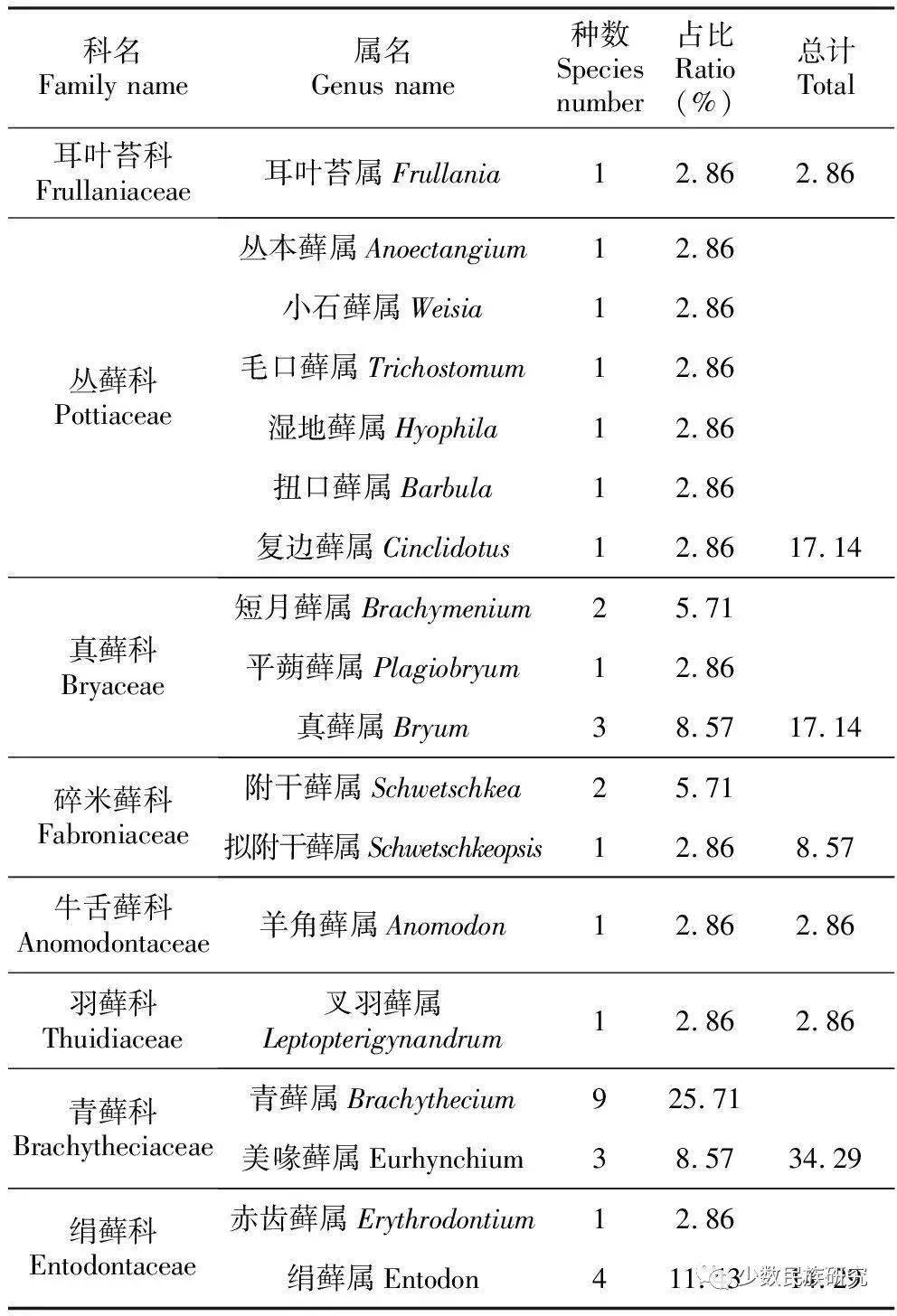 表2宫城遗址苔藓植物科、 属、 种组成统计表