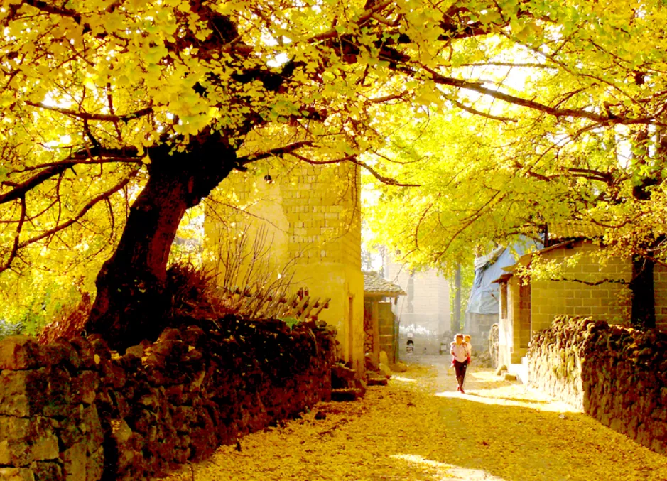 要欣赏银杏最好在村里住上一晚,清晨的阳光还没出来,整个村子都被一层薄薄的晨雾笼罩,静谧村中小路铺满了落下的银杏叶。漫步在宁静的小道上,踏着金黄色的落叶,别有一番浪漫气息。