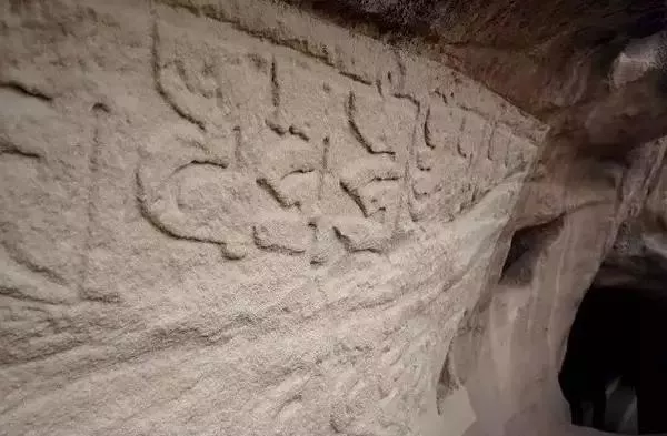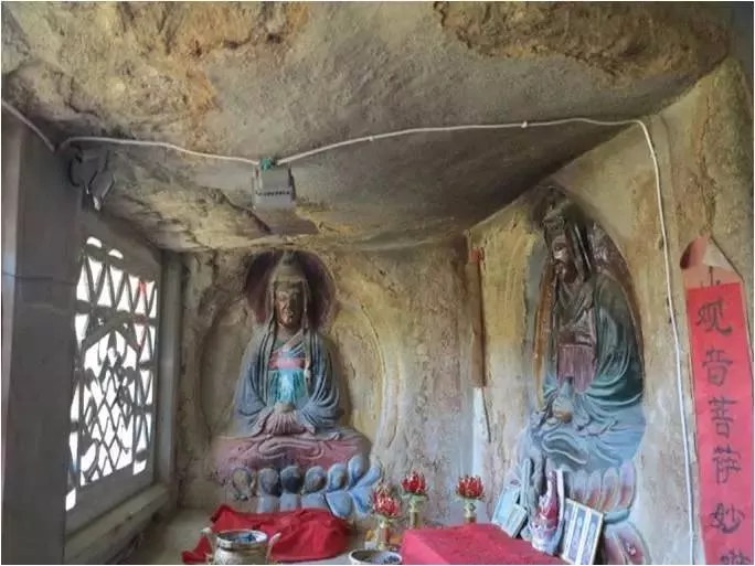 吾观石窟,乃天然洞穴与人工开凿结合。从左至右,先入目者为人工向石山纵深开凿一走廊,深15米,宽1.5米,高1.8米,走廊两旁左右凿石屋各三间,每间6到8平方米大小,据说为清代牛姓大户所开凿。寺院石窟共三进。窟与窟有小方门或小圆洞贯通。入第一窟,外看不太大,窟内竟呈喇嘛帽状,不规则,高3丈余,主房约49平方米,窟内通体漆黑,疑为烟火久熏所致。奇怪的是,窟之左、右、后又有小窟若干,或天然或人凿,其右上侧有人可攀登的小手挖,上面一个天然石窝,可容八九人,石窝之右侧又有人工开凿的一石窟房,居高临下,16平方米,可住人。大厅中间凿一石方台,上供观音菩萨金身,台前有香炉,香烟袅袅。观音台背后石壁,又凿3间石屋,每间可容4人夜宿。洞口临河,石门石窗,雕以花纹。临窗左侧原有天然小洞猫腰可达第二石窟,近年人工凿出一人高、一米宽的通道直通过去,虽方便不少,却少了些奇险。第二石窟依然为天然形成,长2丈,宽1丈,高9尺许,有佛台,据说原来仅供藏传佛教格鲁派创始人宗喀巴佛,后增塑文殊、普贤两尊菩萨像。壁内外石墙上满刻着梵文,字大盈尺,有人认为是梵文“六字真言”,这是陕西境内鲜见的一处用梵文雕刻的摩崖石刻。再过一洞,便是最后一处石窟,内皆石刻,右角为高1.5米的石刻聚莲白塔,正面一宗浮雕法相,跏趺盘坐于莲花上,着黄帽,身后石刻舟型大背光,此尊藏传佛教法相应为宗喀巴;左拐角两尊浮雕,也为藏传佛教法相。此三尊石刻浮雕法相,头上皆着黄帽,盘膝端坐于莲花宝座上,雕工娴熟,工艺精湛,造型生动逼真,历几百年毫发无损,实在难得。