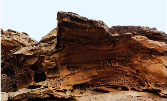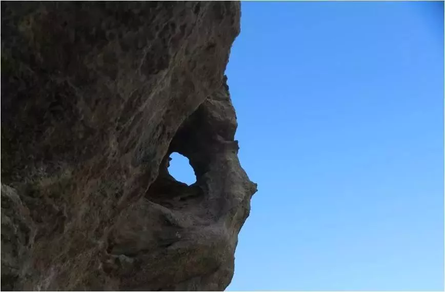 属相山正面悬崖,壁垂百仞,即使灵巧如猱猿者也绝无攀上去的可能。因方圆目之所见皆石山,无耕作,周围鲜有人烟,近几十年除偶有牧者外几乎没人上去过,要登山,无路可寻。迂回后面小沟左侧,乱石林,杂草丛,登至半山腰,多有险处。好在风化的石洞、石林、石峁,奇形怪状,足以提神。小沟对面早见石畔上蹲一只丈余大巨石龟,龟头探视沟底,欲下山状;龟脯攀一只蟾蜍,活灵活现。大家对着奇石“咔嚓咔嚓”拍了起来。山凹里有的巨岩经风化,石檐头下犹如能工巧匠雕刻者,形成一座座庄园,若过洞,若楼阁,若车道,房屋盈寸,纵横交错,一如绝佳的古村落风貌,让人赞叹不已。半山腰一平坦处横卧着一匹石马,此“马”为红砂岩石风化而成,呈卧状,5米长,1米高,头微昂,眼微合,口鼻清晰,四蹄窝盘,通体光滑,仿佛一匹巨型汗血宝马饱食后正在草湾歇息,马身后30米开外有几座古人用石头垒成如敖包似的石塔,但究竟是敖包还是石塔抑或是石垒的墓葬?无人说清。