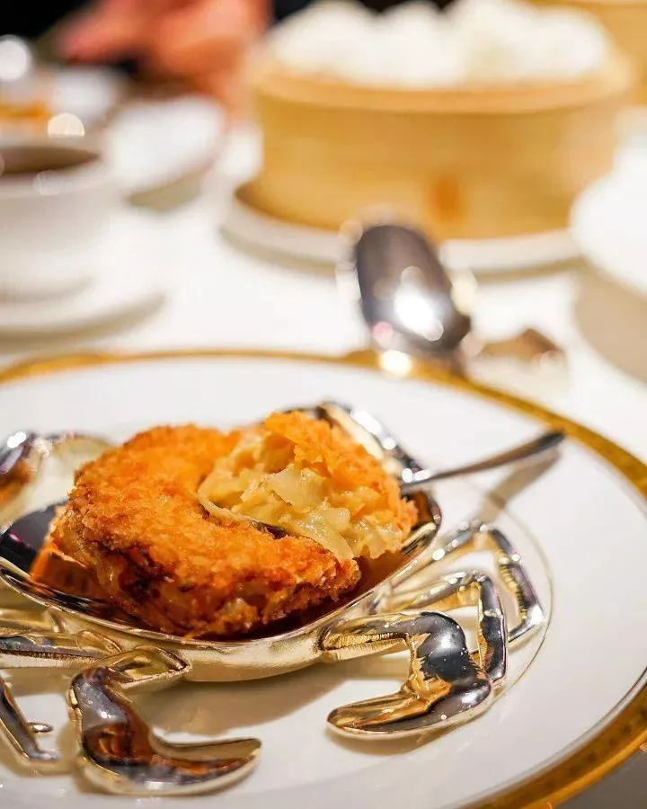 它的创作灵感是用松叶蟹盖,配上篮花蟹肶肉、洋葱、日本来的元贝件做馅料。松叶蟹盖装满了蟹黄及蟹肉,香浓鲜味,用炸酿的烹调手法最为合适。