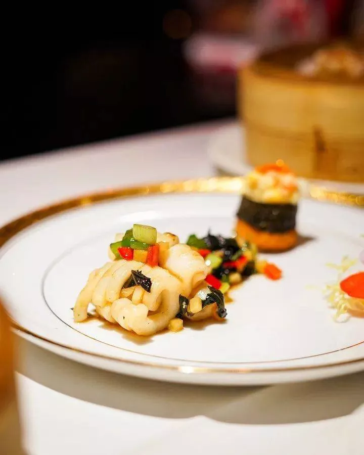 这道菜颜色丰富,它不仅有紫苏叶、大叶,还有干葱等,用7种配料来佐这道菜,可以让鲜嫩的鱿鱼充分吸收这些香料的精华,呈现出又有咸味、又有鲜味、更有香味的感受。最难得的是,它还用日本干鲍汁来炒,让人饱尝高品质体验。