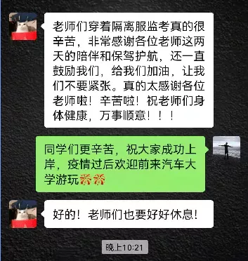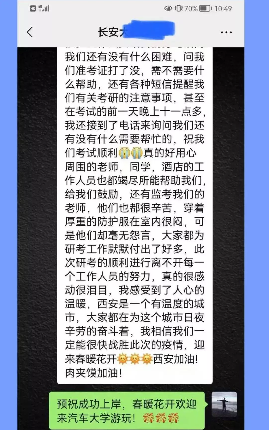 “秦老师好!我是李同学,之前为了考研复习来长安大学找同学借用复习资料,却因为疫情滞留在学校出不去了。从那以后我的心态很差,没有状态复习,而且我也被转运的隔离酒店,也不知道能不能考试。昨天考试顺利进行,这多亏了您给我及时通知相关信息,并协调处理,特别感谢研究生院张嘉琪老师的努力与付出,让我能如期参加研究生考试(我没有她的QQ,知道她忙没好意思打电话,一定请您转告)在这个特殊的时期交了一份相对满意的答卷。这段时间还是给老师添了很多麻烦。在这里,我由衷的感谢秦承暄老师和张老师,祝您们工作顺利身体健康万事如意!在这些日子里,希望你们照顾好自己,注意休息,做好个人防护,你们的平安是学生们的最大保障。再一次感谢您们。也祝愿长安大学所有老师工作顺利,身体健康。”
