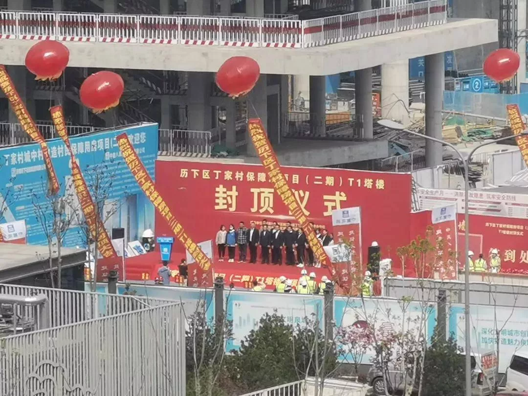 根据楼友“泉”提供的照片显示,该项目T1塔楼上挂出了“封顶大吉”的字样,并举行了封顶仪式。