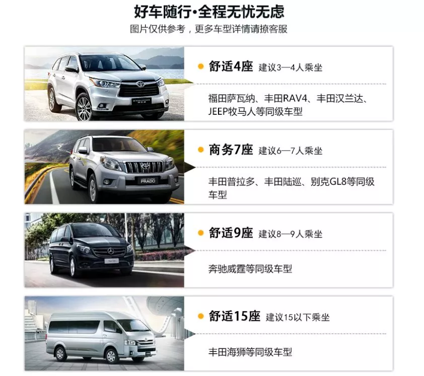 拼车:商务车(RAV4/萨瓦纳/H8/GL8等)、越野车(普拉多)