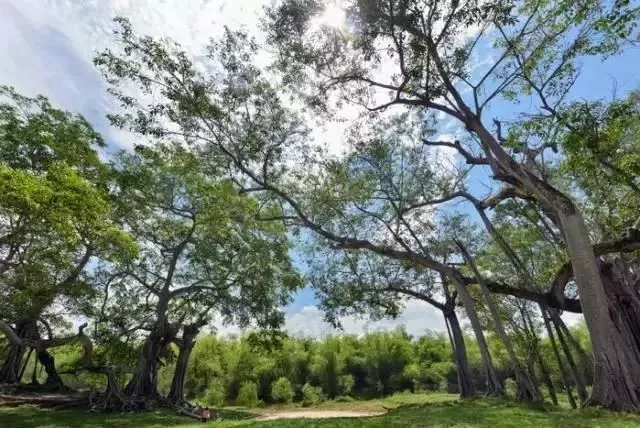 榕树高达30米,可向四面无限伸展。其支柱根和枝干交织在一起,形似稠密的丛林,因此被称为“独木成林”。