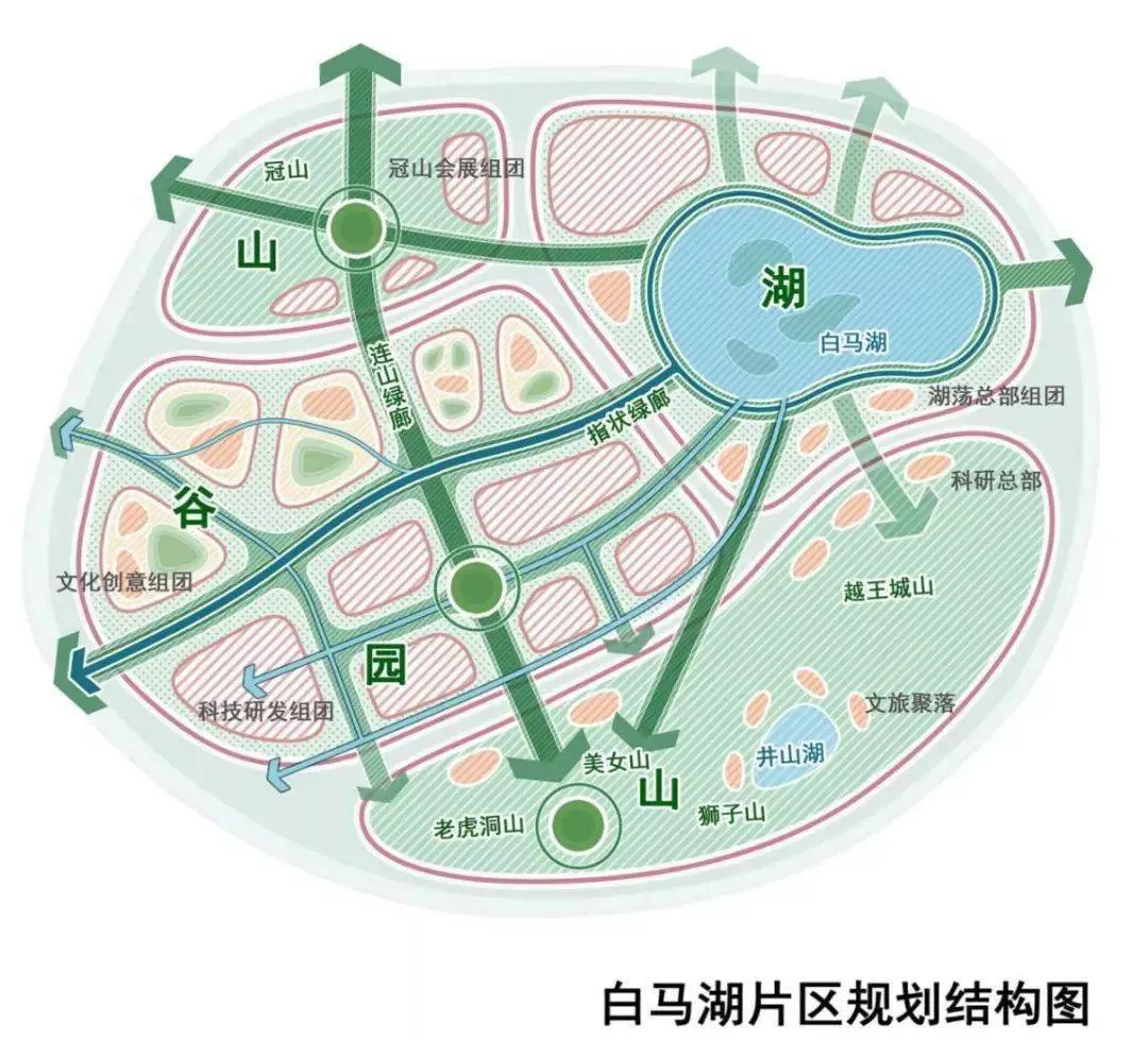 规划构建“一湖两山引多廊,群组融绿塑五区”的规划结构。一湖即白马湖生态绿心;两山为冠山与越王城山-美女山;多廊为沿湖放射绿廊与连山绿廊;五区包括环湖科创休闲组团、冠山会展组团、原乡文创绿谷组团、河网科技岛群组团、山水文旅休闲组团。