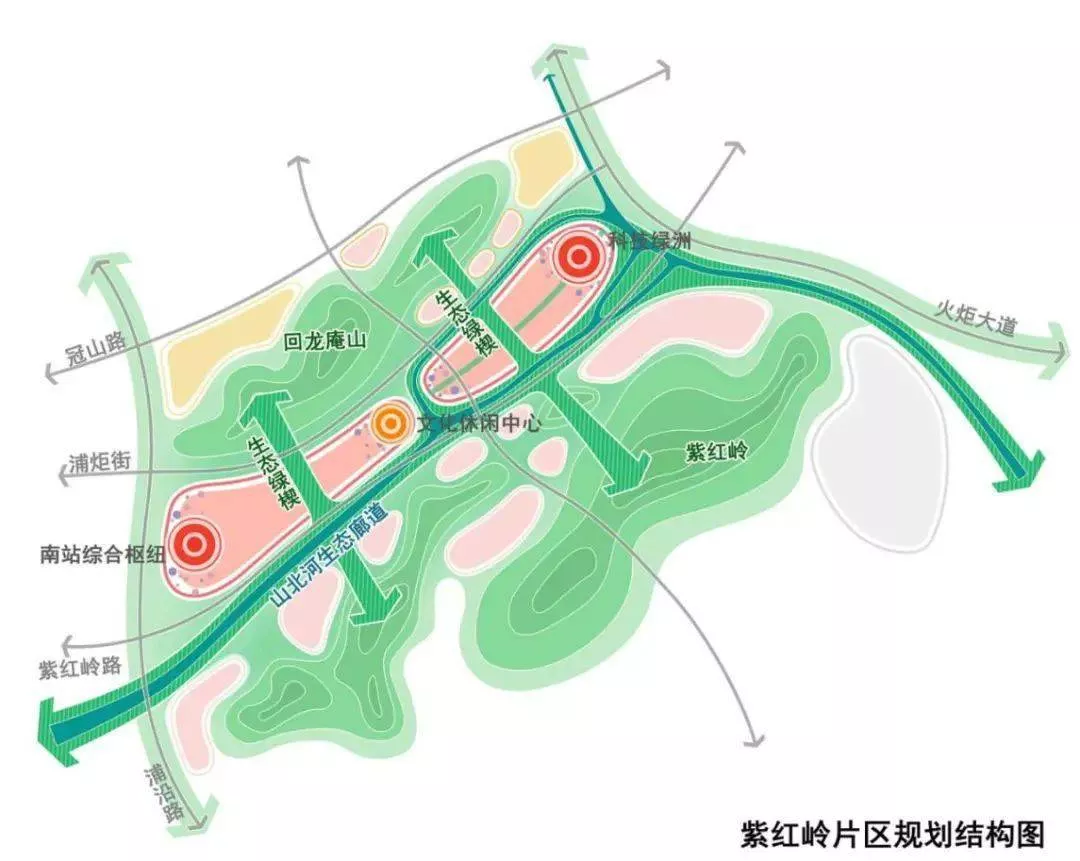 基于现状“两山一谷,溪涧中流”的地貌特征,引水塑洲,在强化河谷主廊生态本底的同时,引动“科技绿洲”项目集聚创新要素,实现片区绿色转型与创新升级,打造集绿色、创新、活力于一体的紫红岭科技谷。