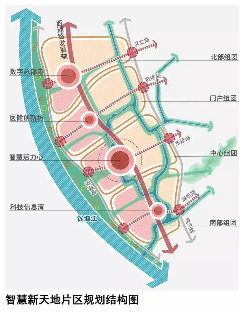 规划构建“一桥立门户、一江展两翼”的规划结构。一桥即西兴大桥门户景观轴;一江为钱塘江及滨江绿带;两翼为沿江蝶形展开的南北组团,包含科创总部基地、国际交流中心和两个健康社区组团。
