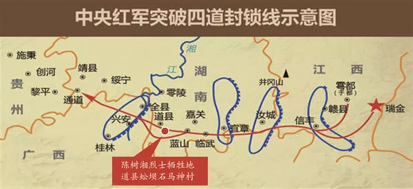 1934年12月1日,陈树湘率领红三十四师6000余人,经过三天三夜的血战,成功掩护中央机关和中革军委纵队、主力红军渡过湘江后,被敌截断前进的道路,无法渡江追赶主力。陈树湘率领红三十四师余部突出重围,转战广西灌阳和道县、江永、江华一带。