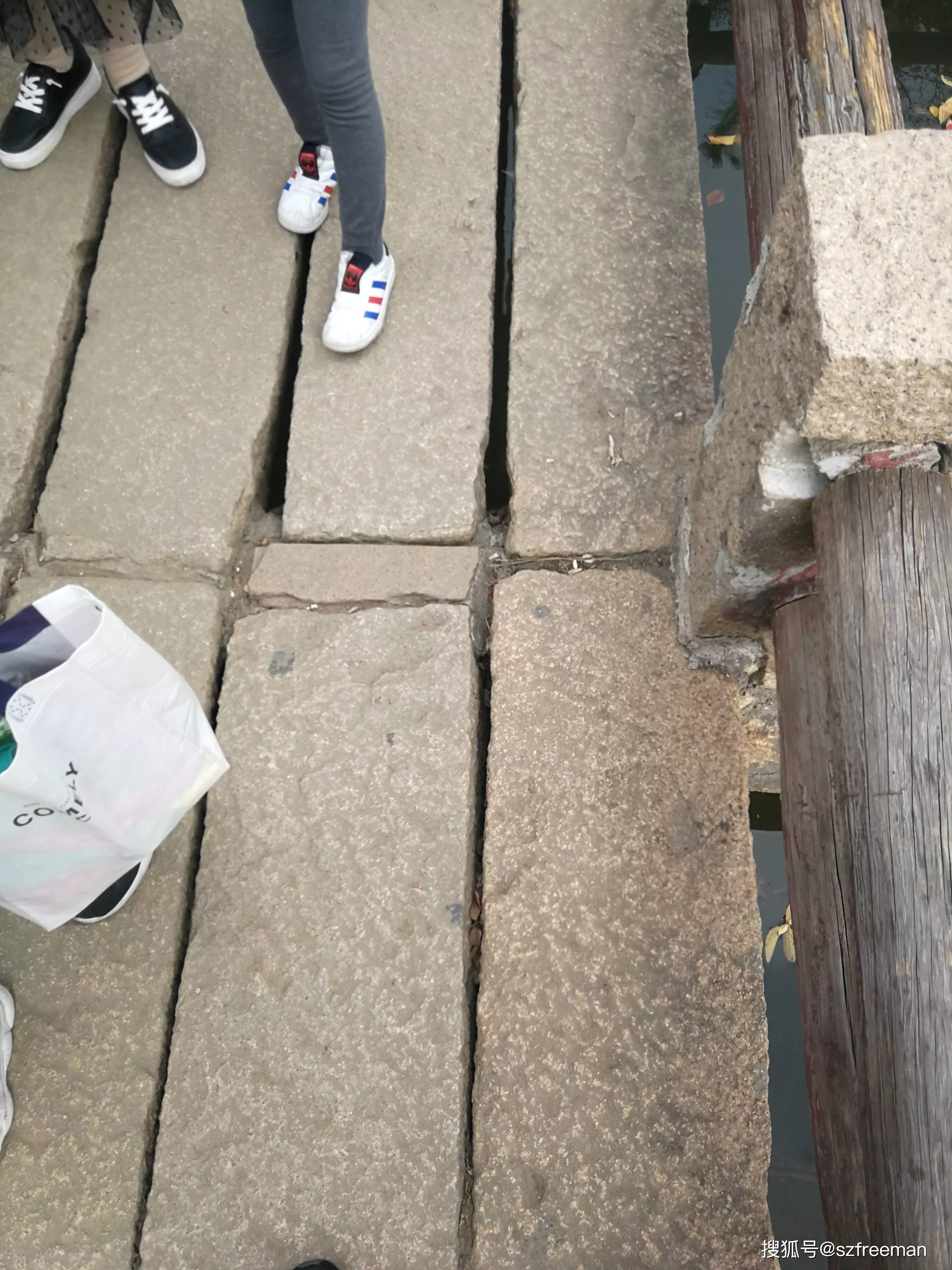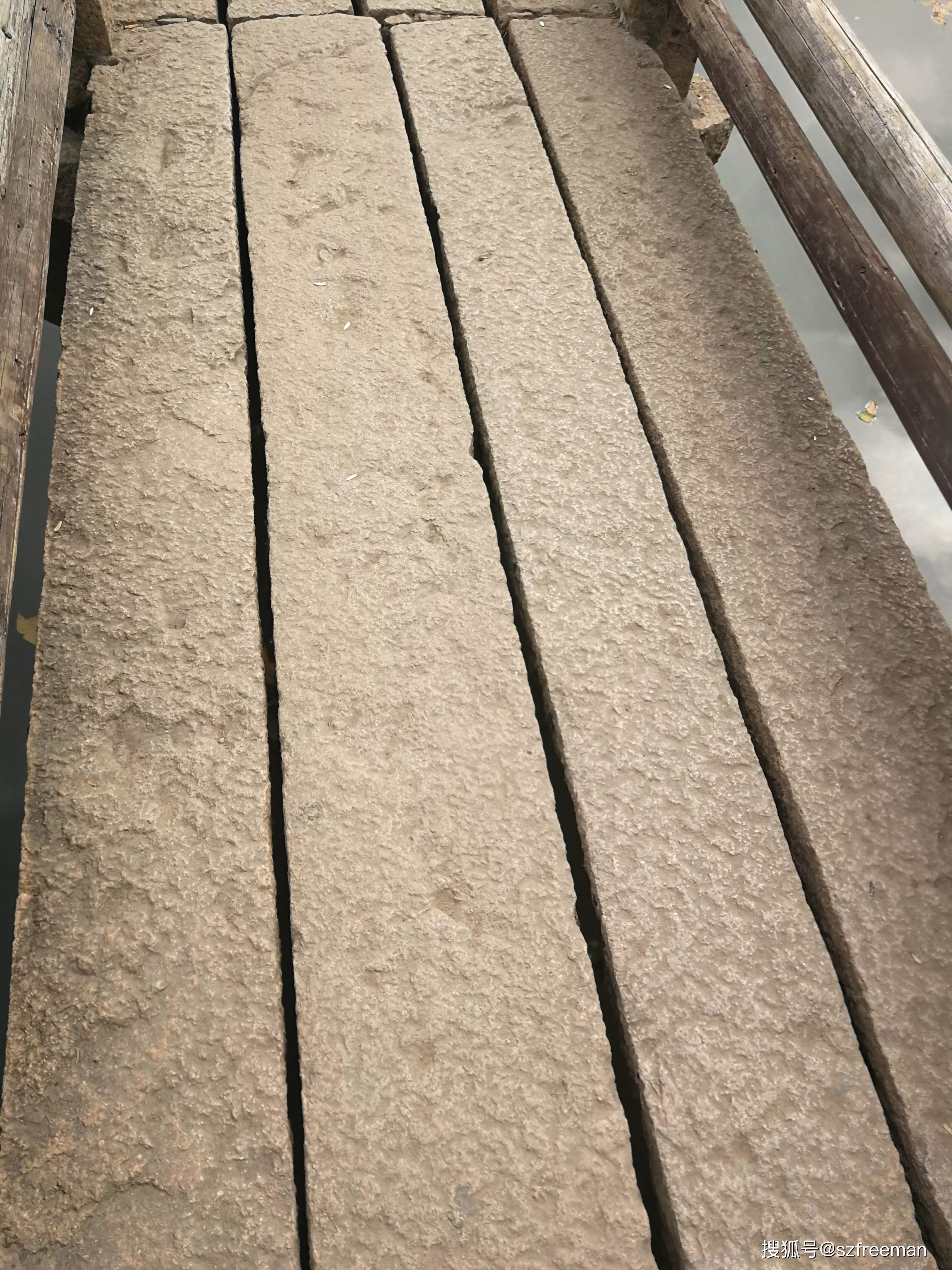 曲桥上长长的石板条,中间有些缝隙。