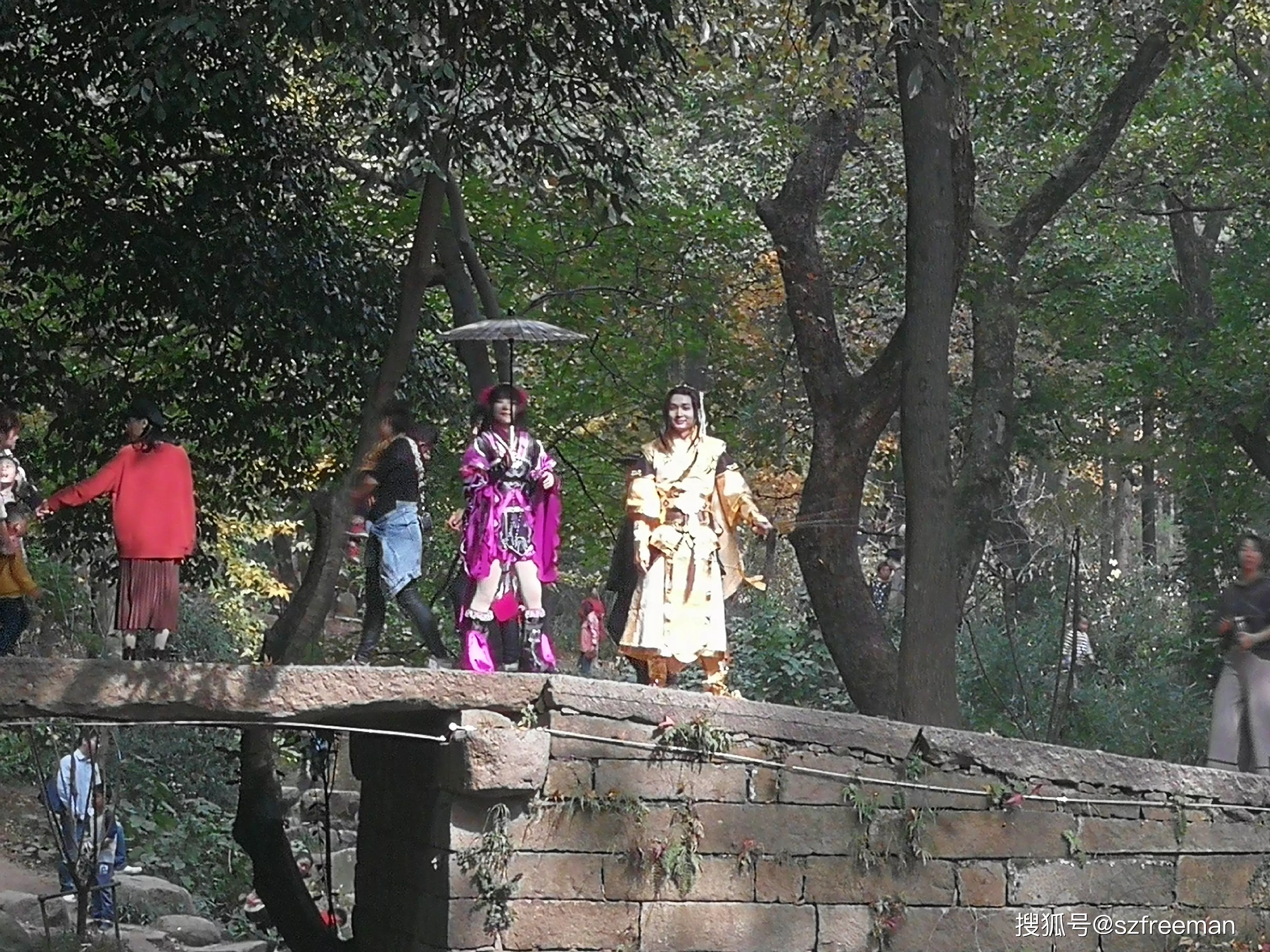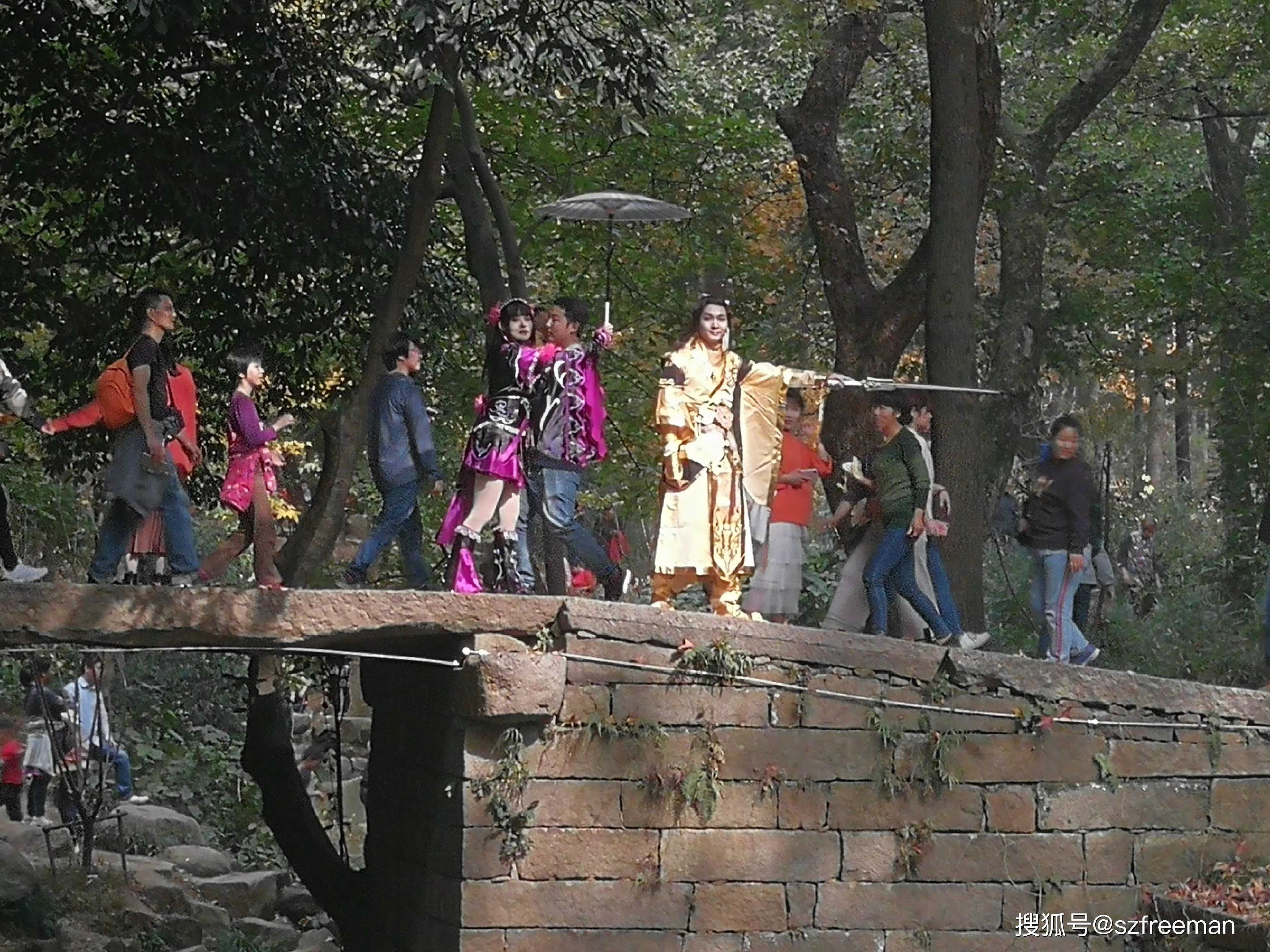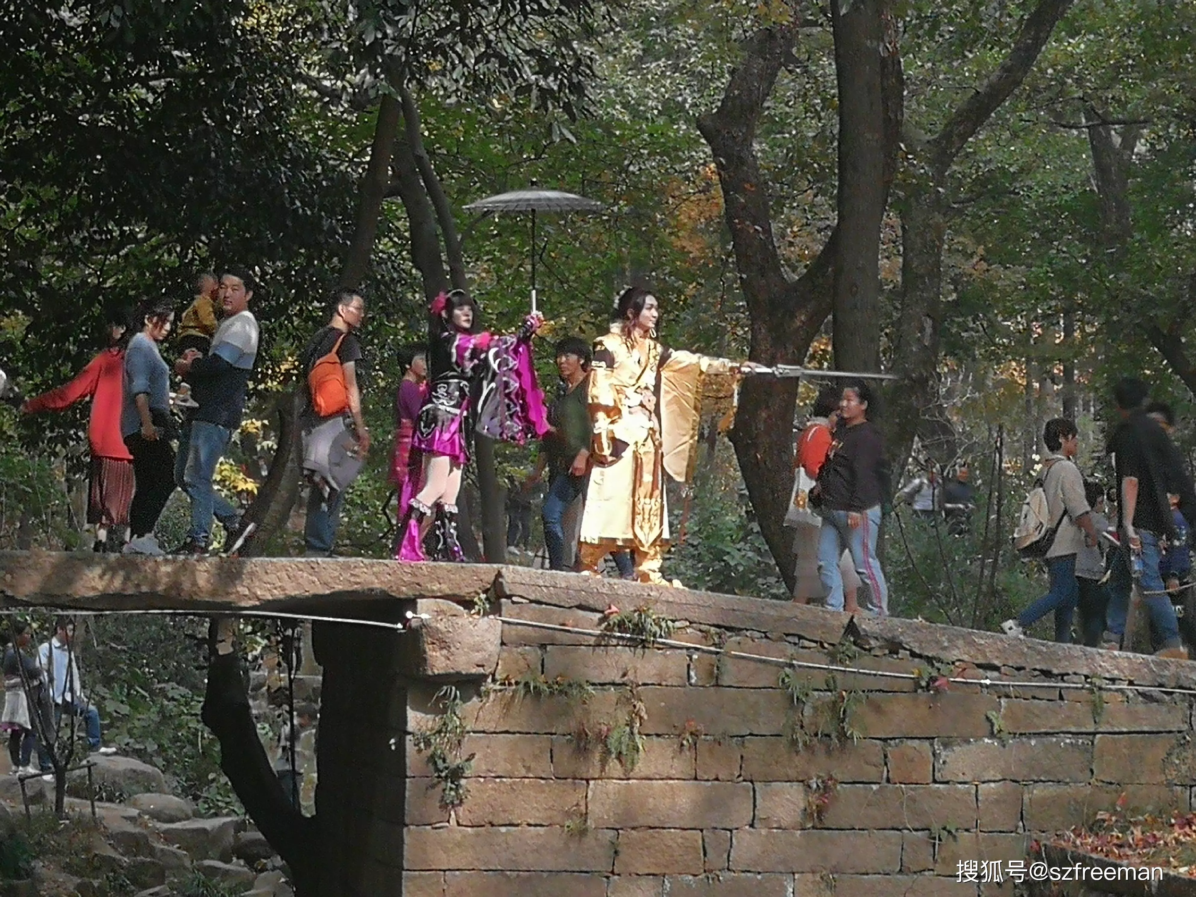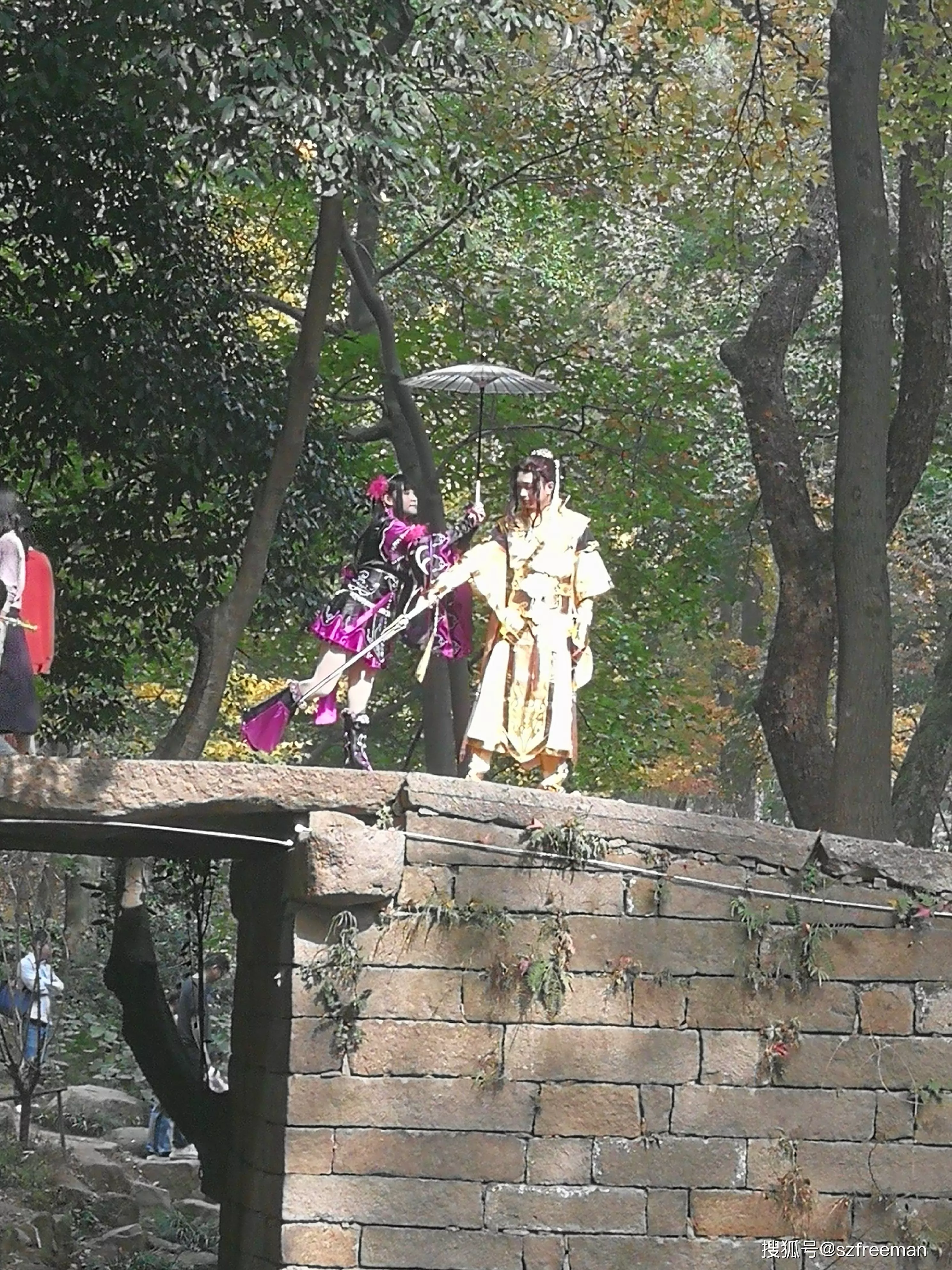 原来是小哥哥小姐姐来拍片了,在桥上舞刀弄枪。