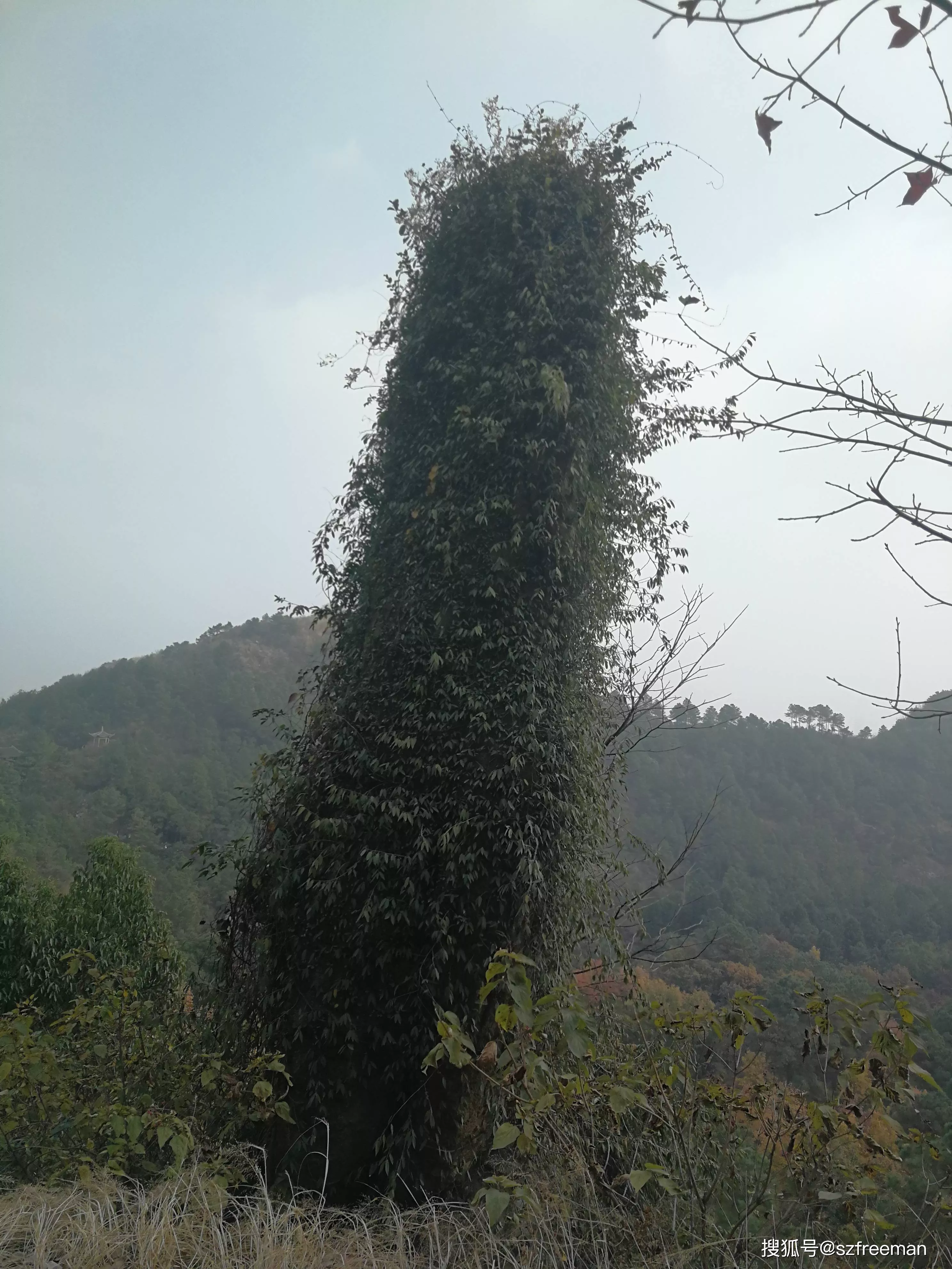 巨石完全被绿色的藤蔓包裹着。