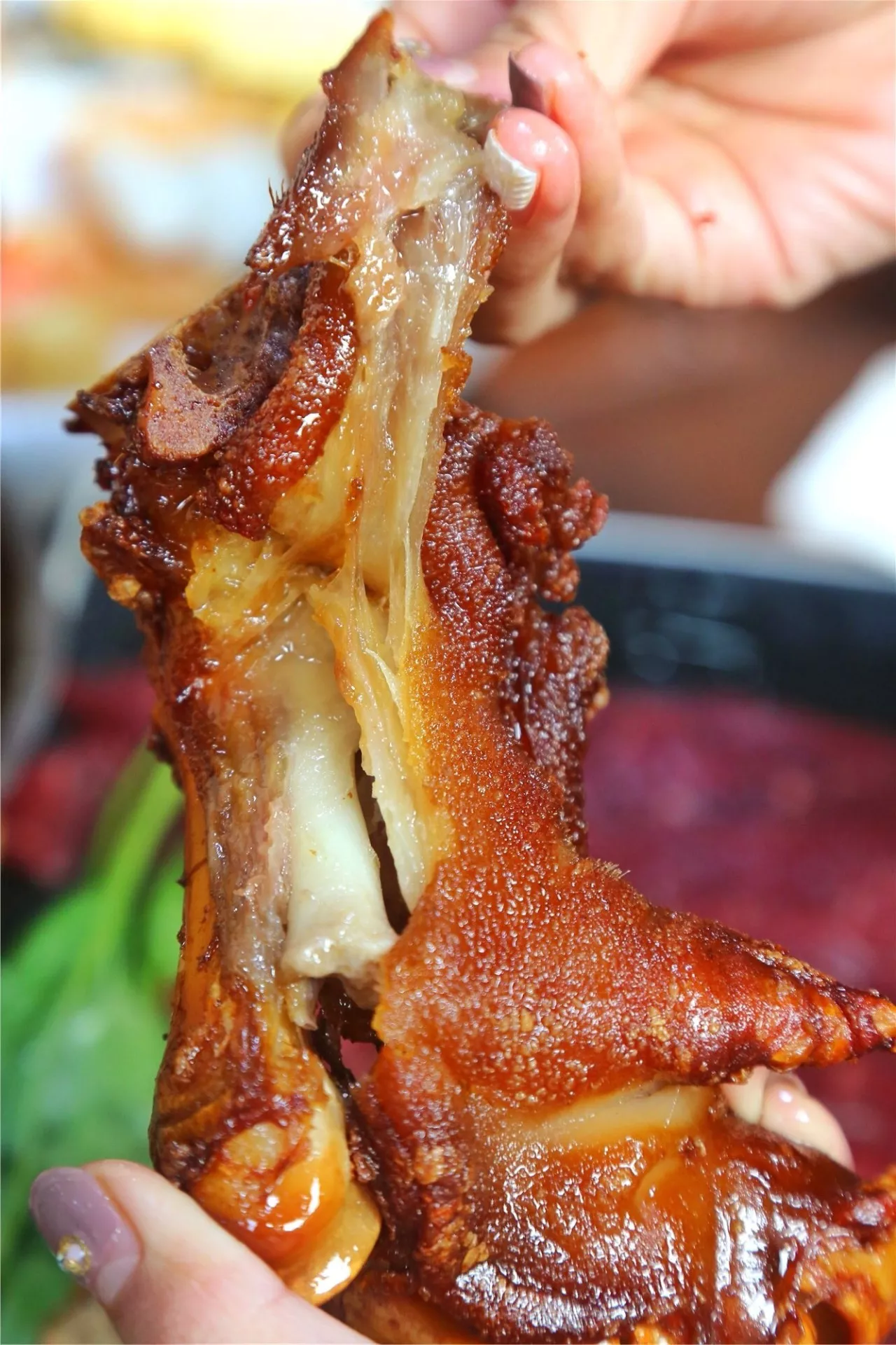 猪蹄已经烤到肉质酥软,随便一扯便是满满的胶原蛋白,外酥里糯,味道很不错~