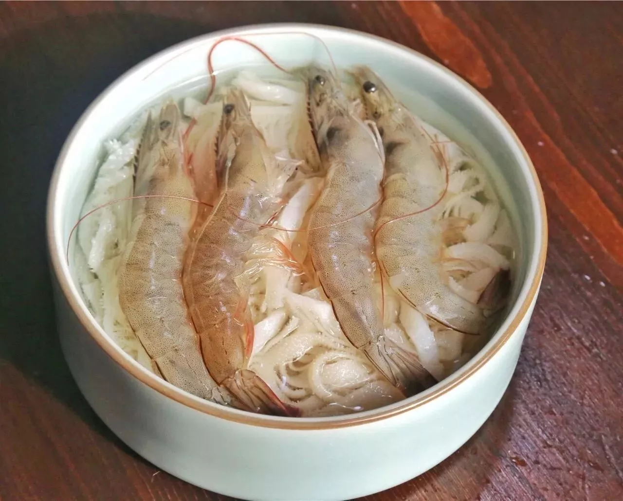 四只基围虾铺在满满的牛百叶上,虾都是当天现买鲜活的,底下一层牛百叶铺的也非常厚实~