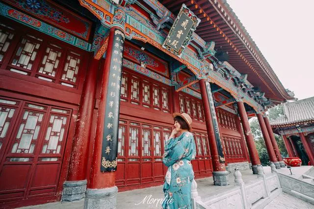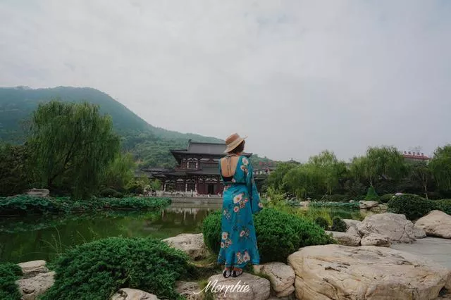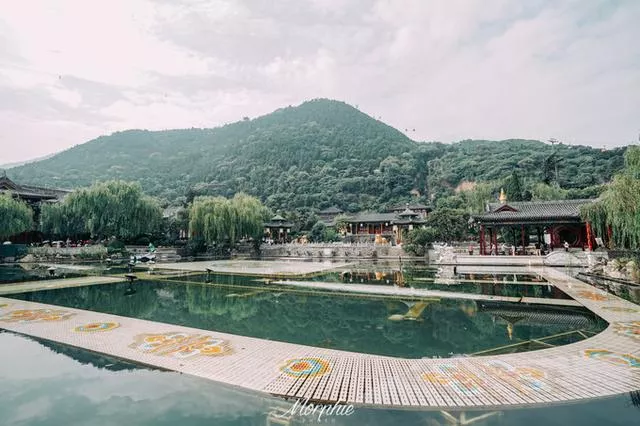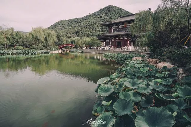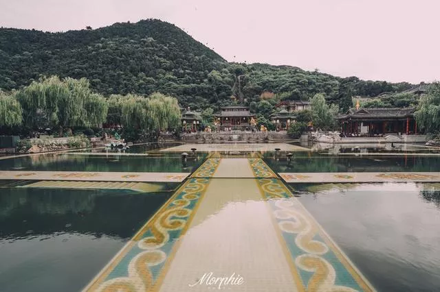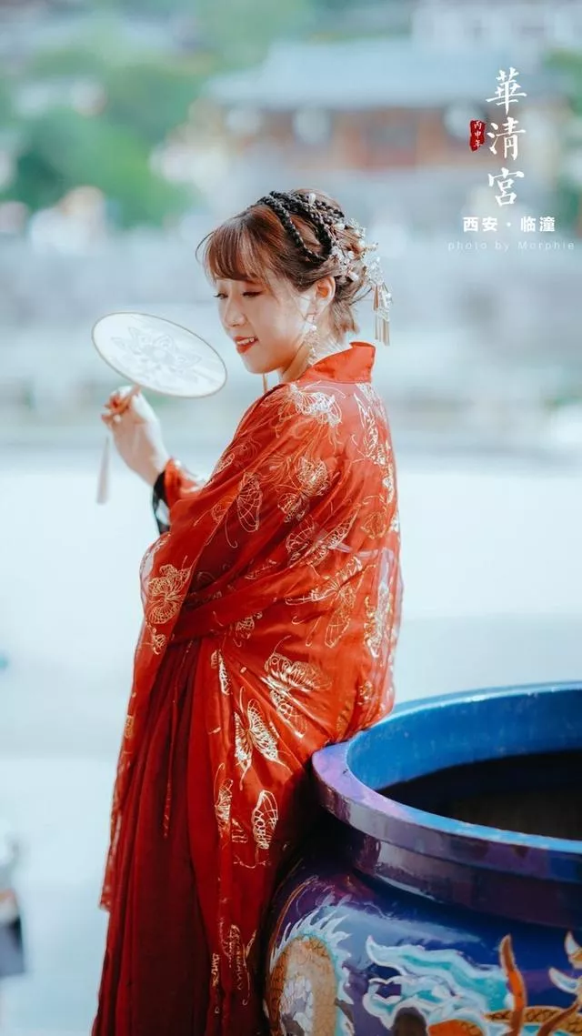 华清宫里最适合拍汉服的就是以 九龙 湖和芙蓉湖为中心的皇家园林区域。 九龙 湖正对着飞霜殿,湖四周的亭台楼榭很是精致,晚上的舞剧《长恨歌》就是以这片华丽的湖水为舞台。