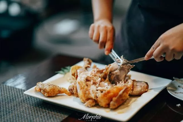 老陕葫芦鸡:葫芦鸡是 陕西 名菜,始于唐朝,和华清宫的唐文化非常匹配了。鸡肉经过清煮、蒸笼、油炸三步,整体呈现出迷人的金黄色,看起来就垂涎欲滴。店员亲自现场剔骨,之后还能复原成一只整鸡的外形。口感可以用炸裂来形容!真正的皮酥肉嫩,筷到脱骨、入口即化~吐血推荐