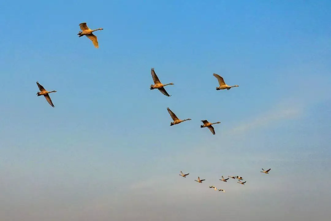 11月13日也发现了45只大天鹅,它们自由翱翔于广袤的天际之间,仿佛在诉说着这方土地的美好。