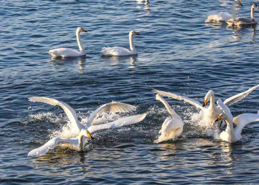 11月13日已经聚集起440余只大天鹅。那洁白的天使于波光粼粼碧水之上,或自在游弋,或追逐戏水,或引吭高歌,或凌空翱翔,或翩翩起舞,使人如临仙境,如梦如幻,如醉如痴,流连忘返……