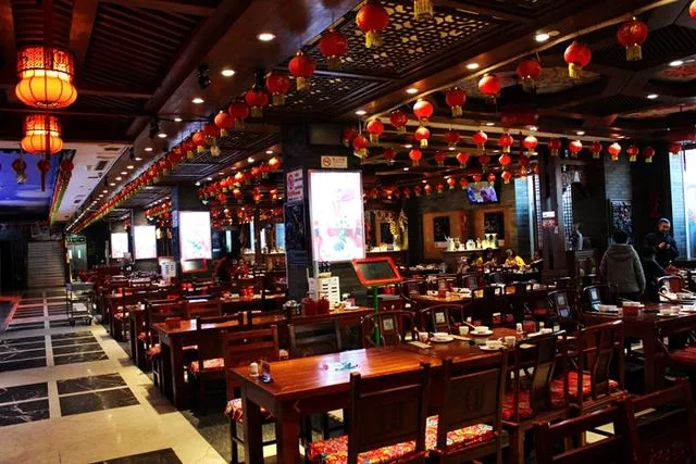 山庄的餐饮大厅 这是按照北京人餐饮风格装修的 在东北必然是喝酒的大桌子 北京都是这种家庭聚会的小桌子