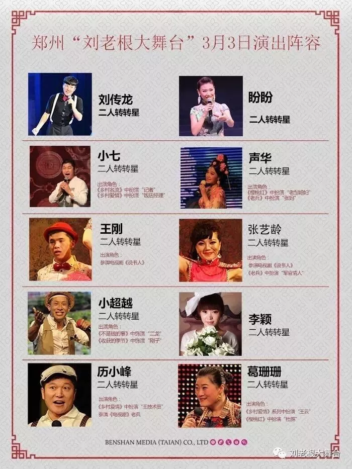 在郑州“刘老根大舞台”上,他们在两个多小时的演出中,奉献出一个个令人捧腹的喜剧节目,和大家近距离欢乐互动,给人们带 来一连串的笑声!