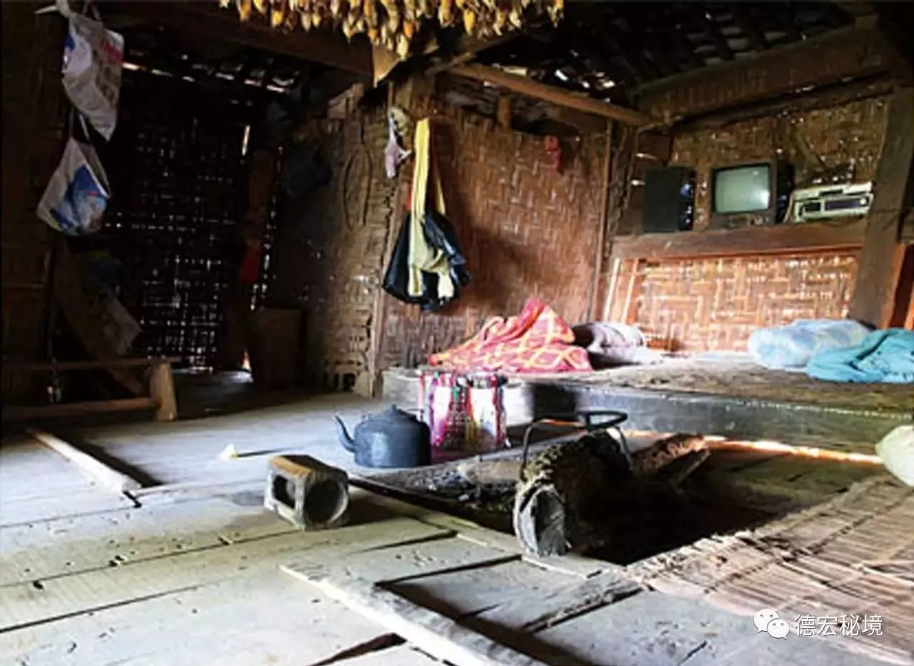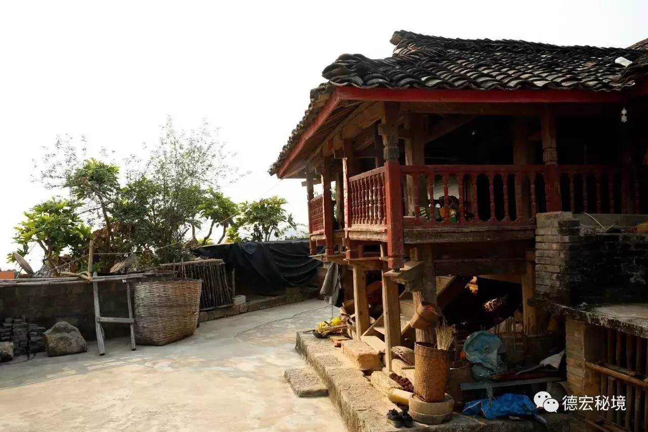 德昂族的传统民居是用龙竹或木料做框架,梁柱之间均用斧凿穿斗结合而成,不用钉子固定,其他部分如椽子、楼板、晒台、围避、门、楼梯等均用竹子作为原料,因此,也称“穿斗房”。
