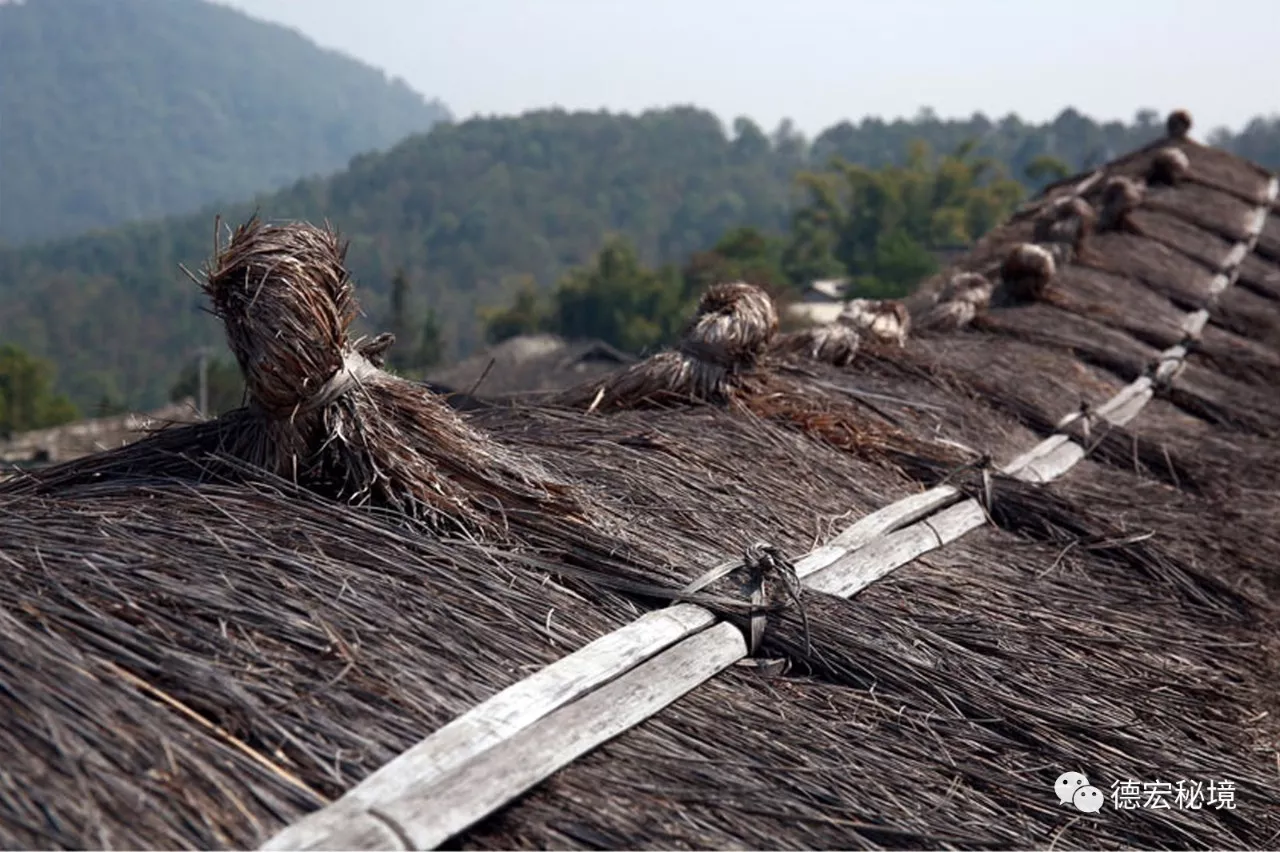 德昂族传统民居的房顶用茅草覆盖,四周都有屋檐,俗称“四檐出水”,房屋的三面两端和檐口向上呈弧形,这种弧形屋面在结构技术上要比直线屋面难度大,充分体现了德昂族精湛的传统建筑工艺和独创精神。