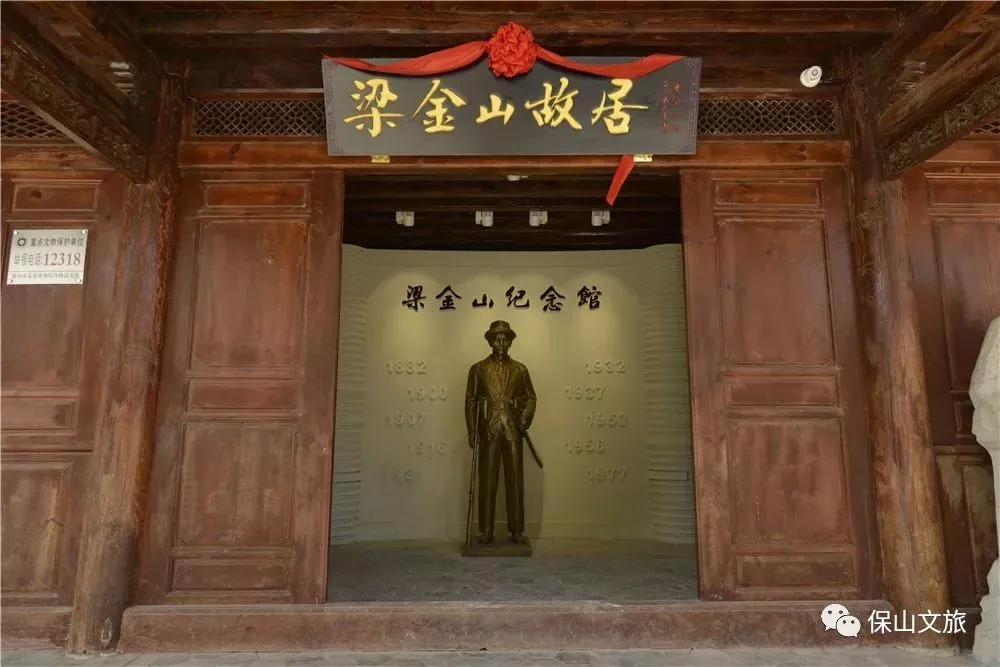 在梁金山故居,我们看到了他的复原雕像,年轻时的梁金山,很是帅气。身后是他居住过的老屋,三个横向排列的封闭式四合院。一楼仿佛还是住家模样,摆放着木床木桌椅等古雅家具,辨识着:这是书房、这是女儿闺房、这是厨房……二楼则改成了几个主题展厅,旧照、文字、古物,分别展示着梁金山不凡的一生。