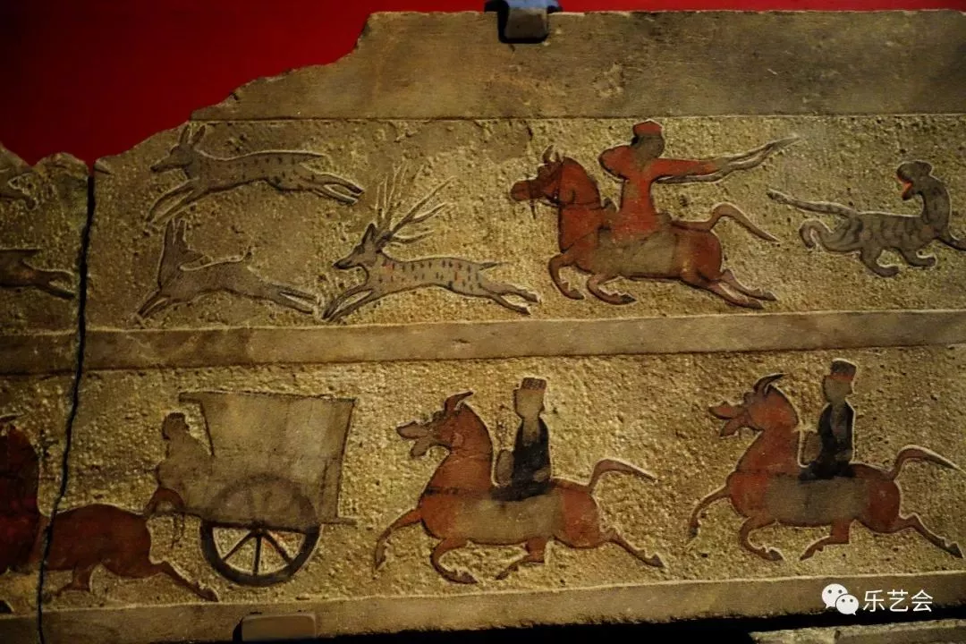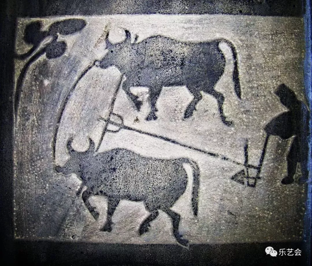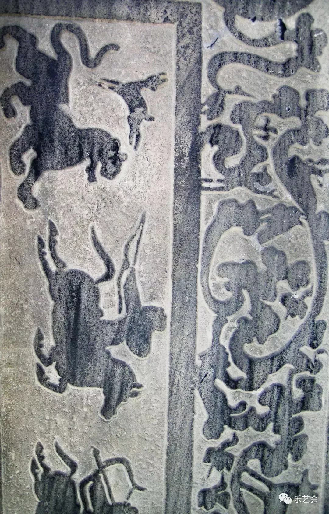 在这几大类中,反映农作和畜牧的场面较多,牛耕、谷物、收割、放牧、驯马等图像常以单个画面表现,一石面上并列多幅;狩猎与车骑出行也较多,一般以横长构图展开宏大场面。陕北在东汉时期属上郡,是汉族与少数民族杂居之地,边塞屯戍导致对牛耕与射猎的重视。祥瑞物象也比较丰富,虎鹿驾车、祥云星座、灵芝仙草等或夹杂于几何纹中为边饰,或集中为一完整画面,在造型上它们与中原地区同类题材相似,但反映历史故事与人物较少。