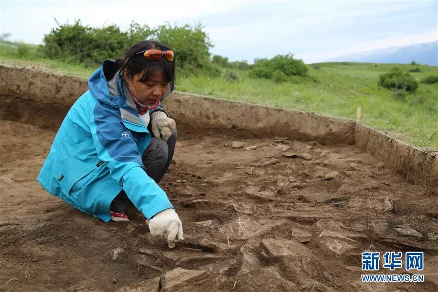 负责石城子遗址发掘工作的新疆文物考古研究所副研究馆员田小红在发掘现场清理瓦片(2016年6月4日摄)。 新华社发(新疆文物考古研究所供图) 图片来源:新华网