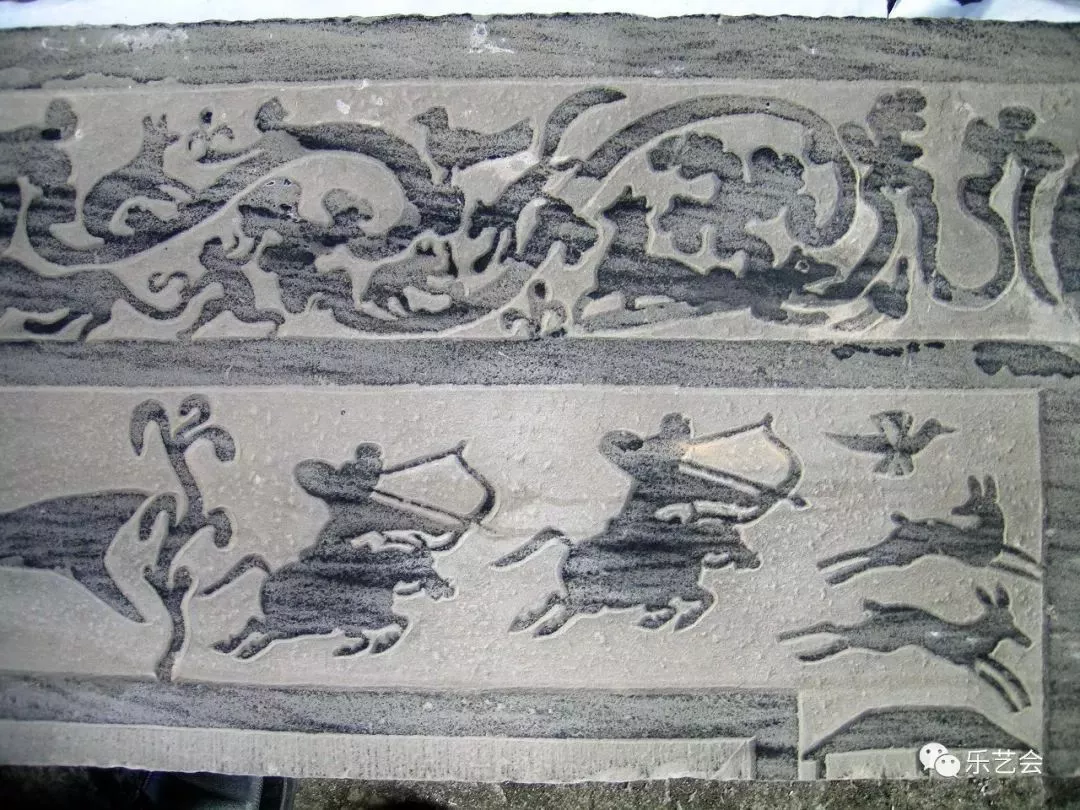 真仿品都采用陕北当地出产的沉积页岩,将自然平整的石面打磨后进行种石料又有青砂石和红砂石之分,这种石料易开采,硬度小,便于雕刻。