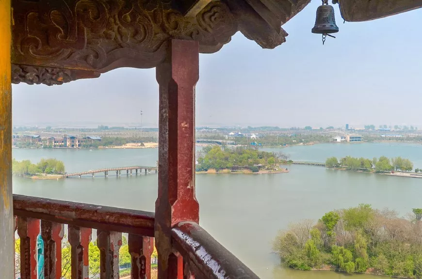 金山海拔只有40多米,沿着台阶就一路上山到山顶了。山上的慈寿塔最早建于南朝齐梁时代,原为两座宝塔,南北相对而立,后倒坍。现存的塔是光绪二十六年(1900年)修建,砖身木檐,可以登顶赏景。