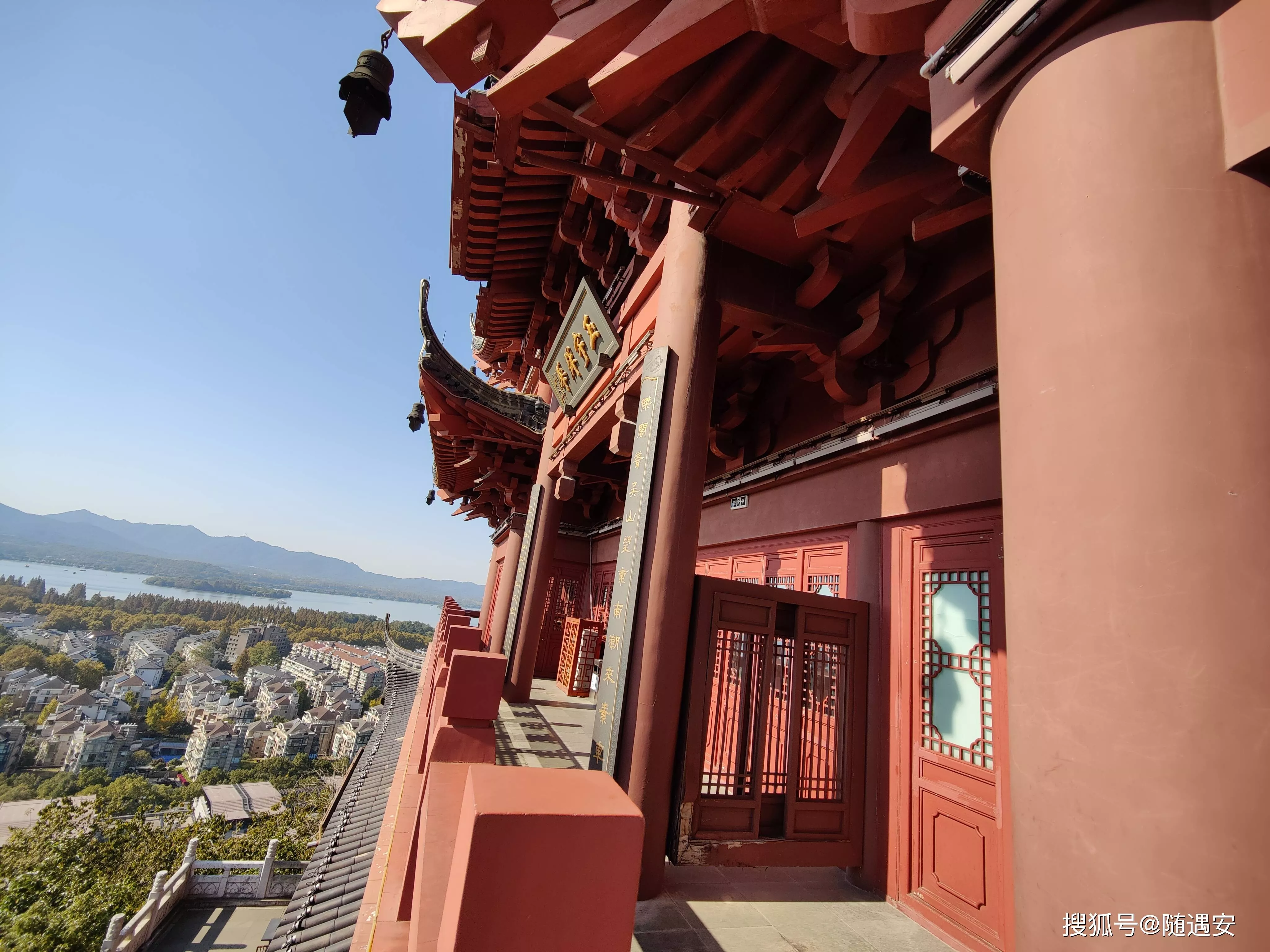 我乘阁内的内部电梯直到七楼,然后再逐层下行。拍摄了各层楼的匾额及多个翘角,感受其凌空飞升的气势。的那大家顶部设计成飞阁,象征凤凰展翅和仙山琼阁,从而让人联想起“龙飞凤舞到钱塘”的神话传说。