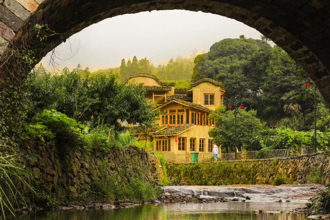 从石拱桥下望过去,民居如在画中。