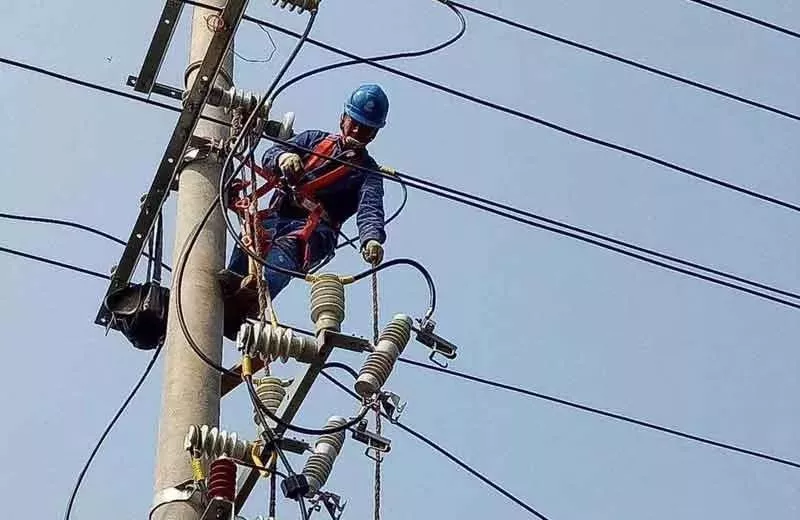 11月2日,湖南衡阳衡东县供电公司员工在草市镇街道10千伏丫洣线14号杆安装出线电缆。(单银屏 苏哲城)