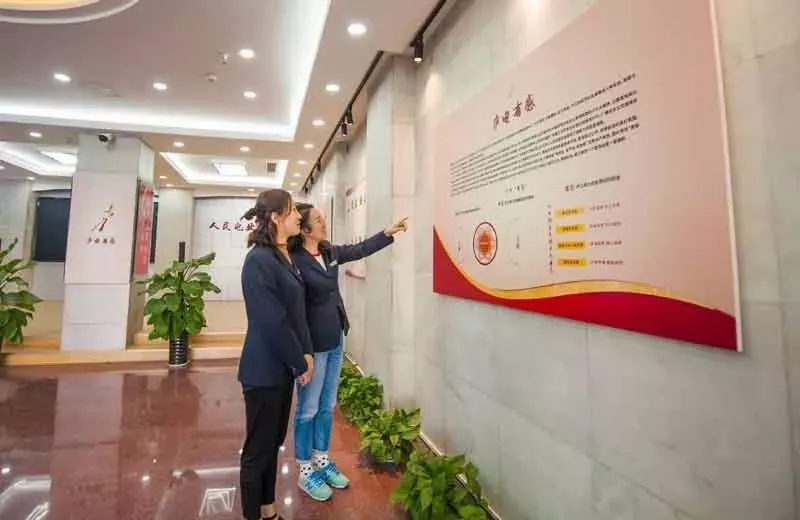 11月2日,安徽合肥庐江县供电公司员工陈霞、胡婧在品牌创建工作室参观学习企业文化宣传展板。(刘俊)