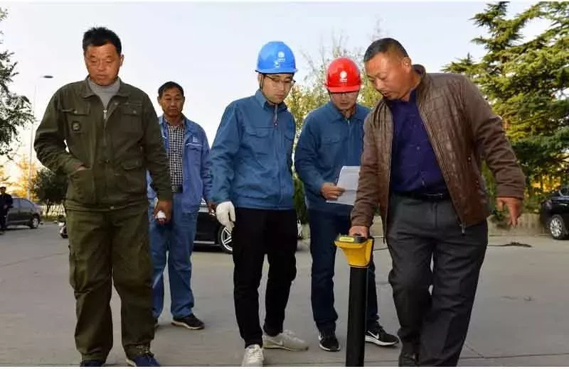 11月2日,山东淄博供电公司员工许小滔、郭路宣在临淄大道配合顶管作业人员绘制电缆路径图。(赵洪臣)