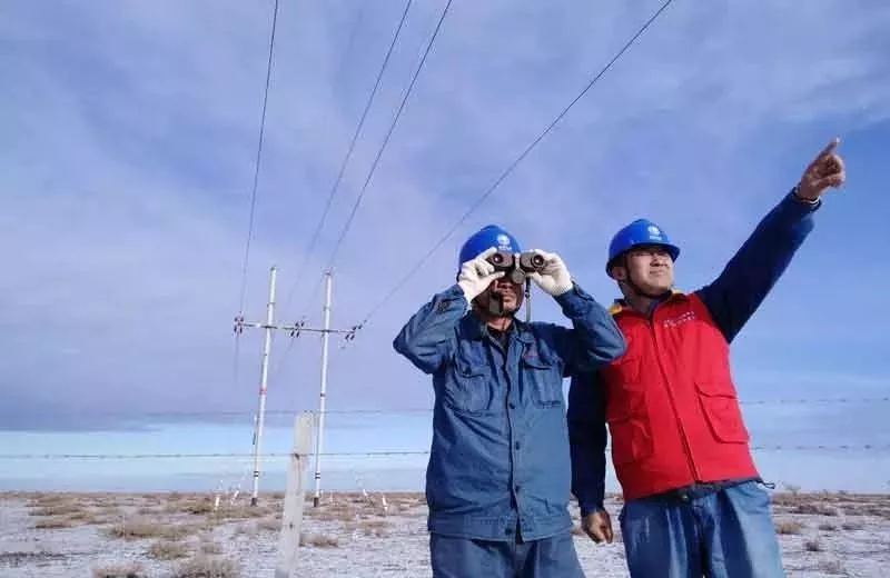 11月2日,新疆阿勒泰供电公司员工金克斯、杜祖胜在布尔津县220千伏龙丰Ⅱ线45号塔处加固防外破警示牌。(陆建刚)