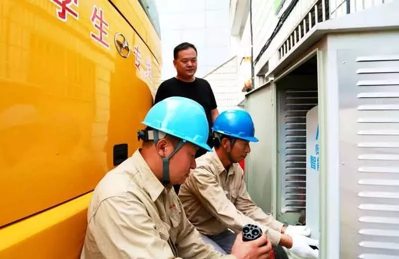 11月2日,江苏扬州江都区供电公司员工陈宜丰、徐世柏在江都实验小学检查电动校车充电桩。(任飞)