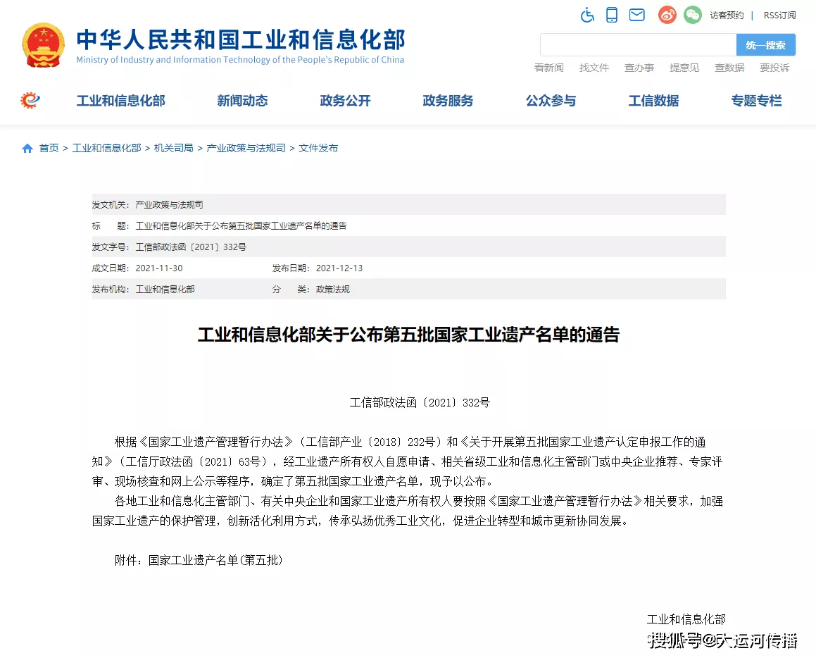 第五批国家工业遗产名单根据《国家工业遗产管理暂行办法》(工信部产业〔2018〕232号)和《关于开展第五批国家工业遗产认定申报工作的通知》(工信厅政法函〔2021〕63号),经工业遗产所有权人自愿申请、相关省级工业和信息化主管部门或中央企业推荐、专家评审、现场核查和网上公示等程序确定。工信部要求各地工业和信息化主管部门、有关中央企业和国家工业遗产所有权人要按照《国家工业遗产管理暂行办法》相关要求,加强国家工业遗产的保护管理,创新活化利用方式,传承弘扬优秀工业文化,促进企业转型和城市更新协同发展。